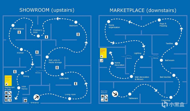 但是宜家是实体店,要求消费者不错过任何一处商品陈列,所以它必然是没有岔路的,只要消费者低着头跟着指引走,就能顺利抵达终点。