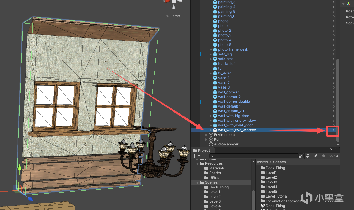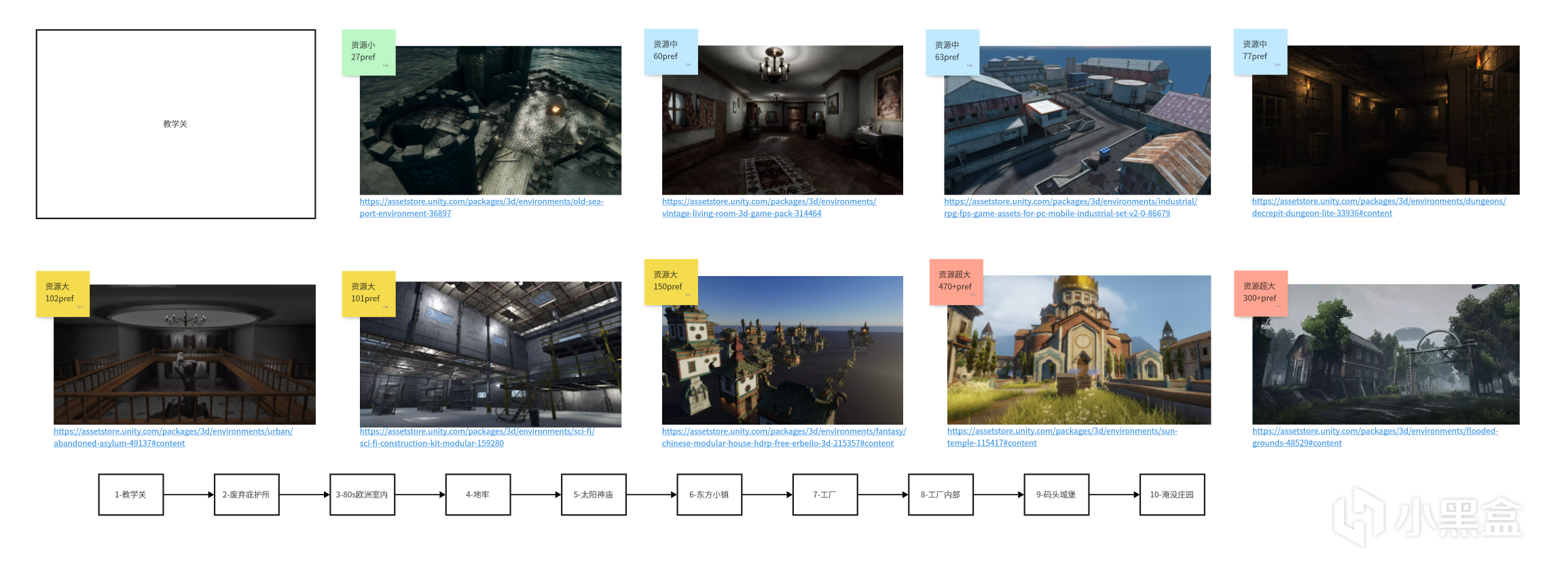 我们的美术资源使用的是Unity商城的免费素材,原因同上,我们没有更多的时间精力来自己做3D素材。我整理了10几套不同题材的素材,根据它们prefab数量由少到多进行排列,最终选择Level1是码头场景,Level2是室内场景。